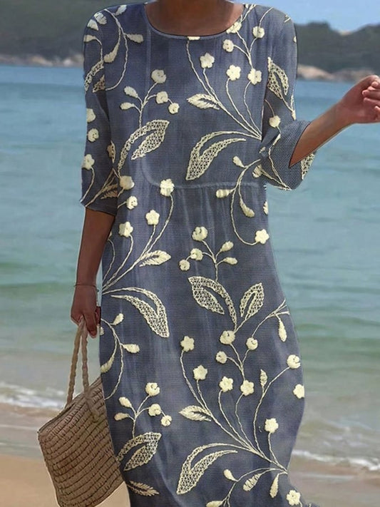 Kerek nyakú, 3/4-es ujjú, mintás maxi ruha