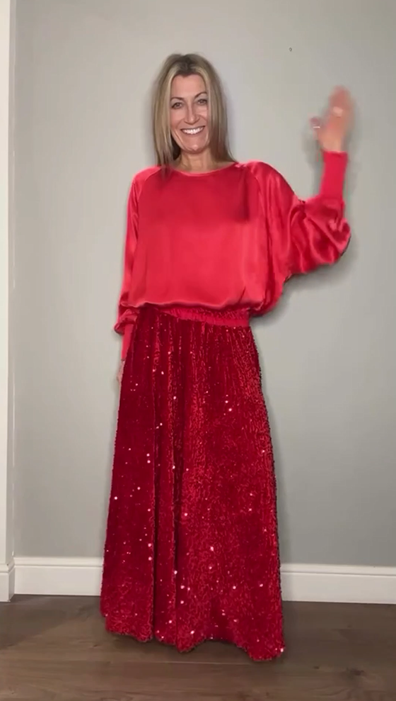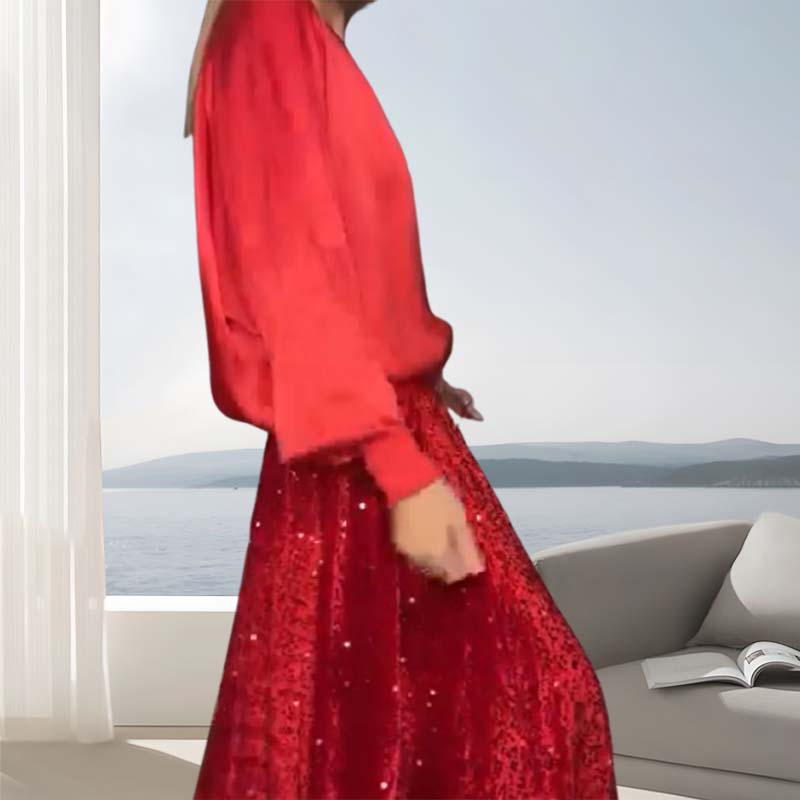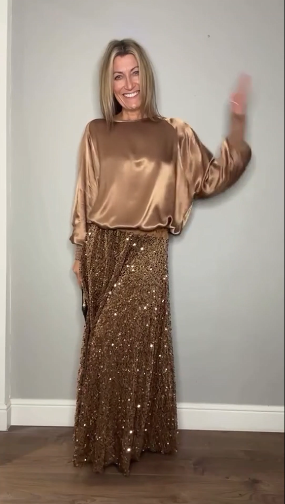 KIVÁLÓ MINŐSÉGŰ ANYAGOK: A puha, légáteresztő felső egész napos kényelmet biztosít, míg a flitteres maxiszoknya tartós flitterekből készült, amelyek többszöri viselet után is érintetlenek maradnak, megőrizve fényüket.
