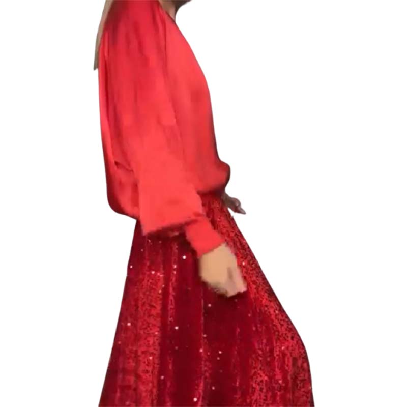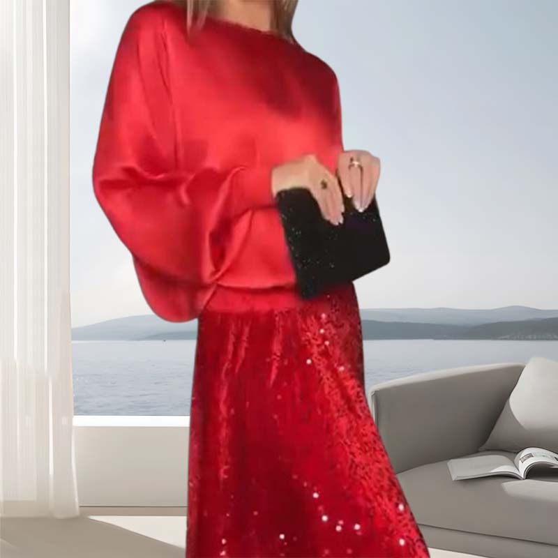 Kétrészes női hosszú ujjú felső és flitteres szoknya