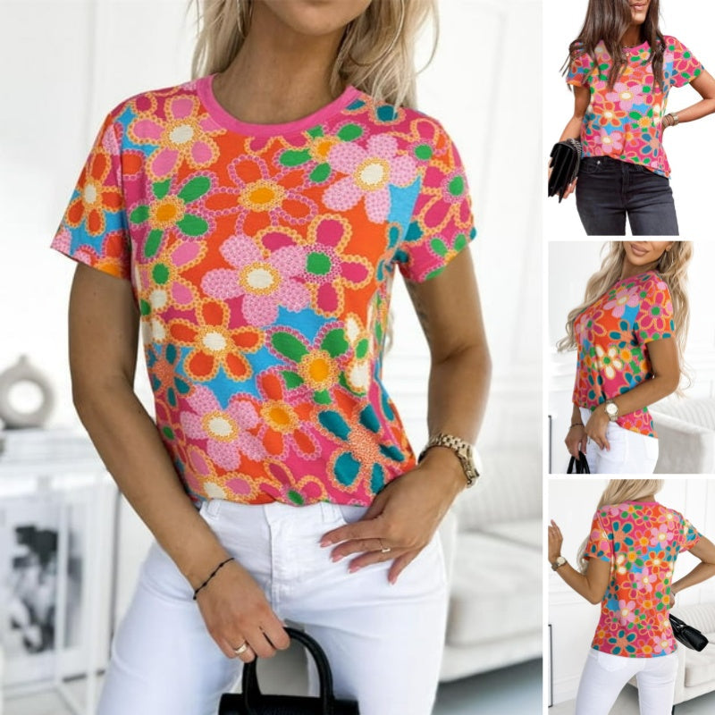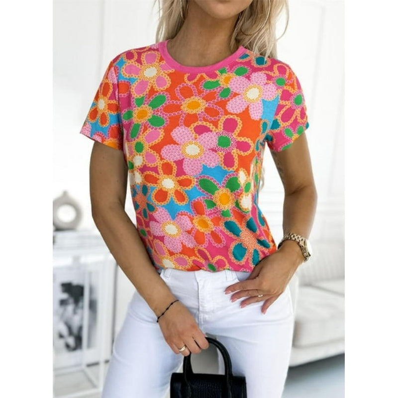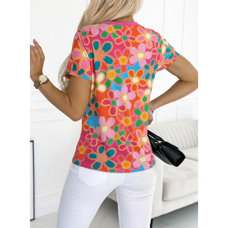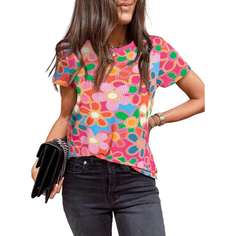 Ez a rózsaszín virágmintás póló gyönyörű és élénk virágmintával rendelkezik, amely nőies és divatos kiegészítője a mindennapi ruhatáradnak. Tökéletes választás bármilyen alkalomra.