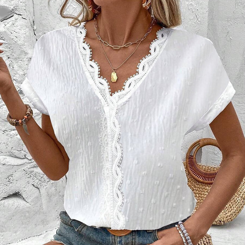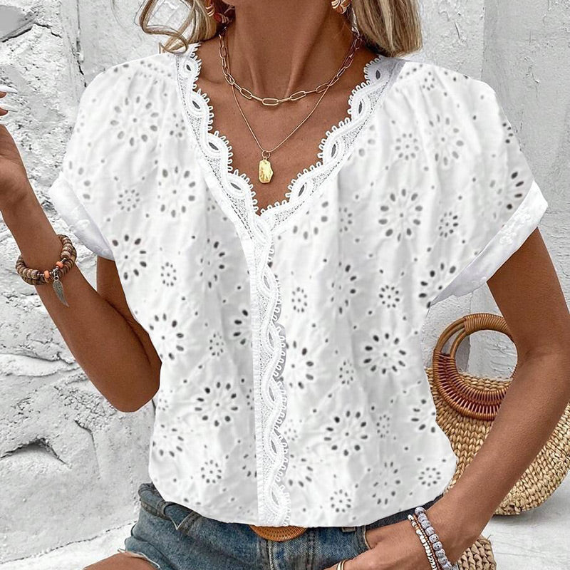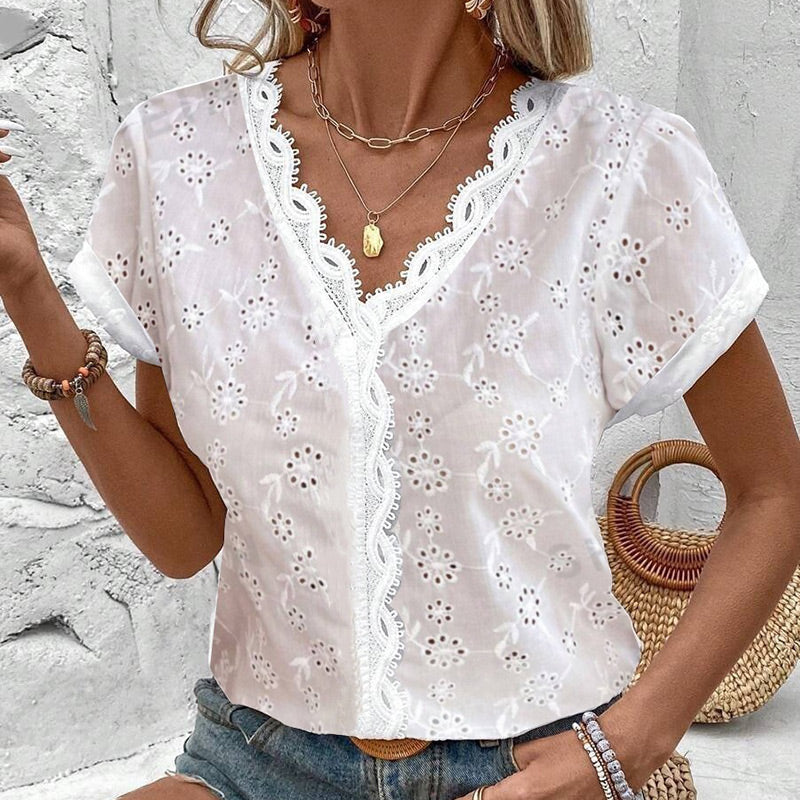 Elegáns fehér csipkés blúz rövid ujjakkal és V-nyakkal