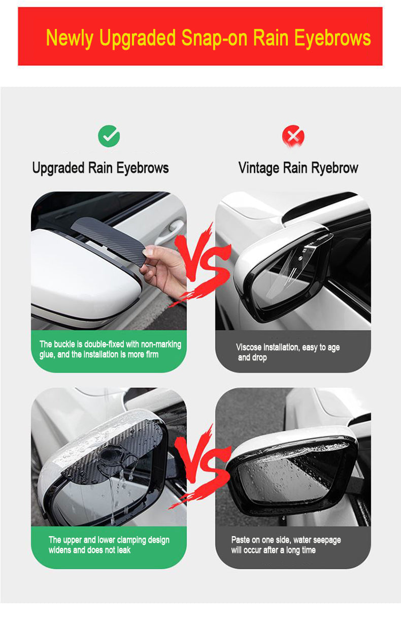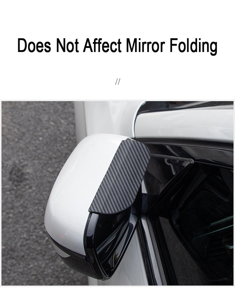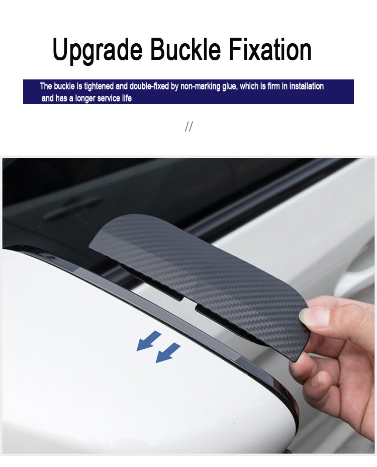 2 darab esőálló lemez új csatokkal, speciális ragasztóval a segédautókhoz, biztonságos, egyszerű és szilárd. A termék szénszálas anyagból készült, amely környezetbarát. A fekete szín bármilyen színű tükrökkel párosítható. A telepítés után nem befolyásolja a visszapillantó tükör behajtását, és nem takarja el a rálátást.