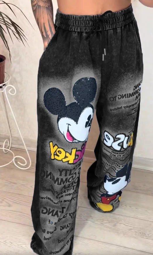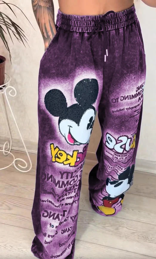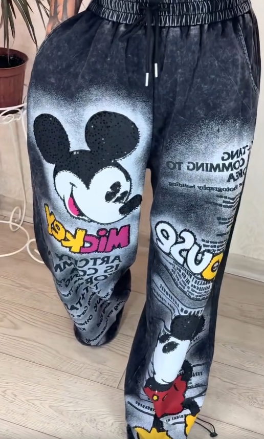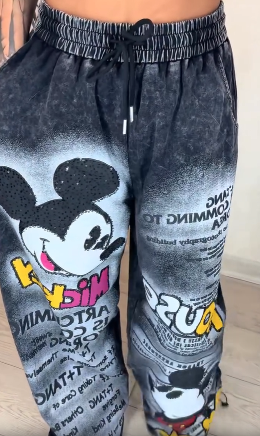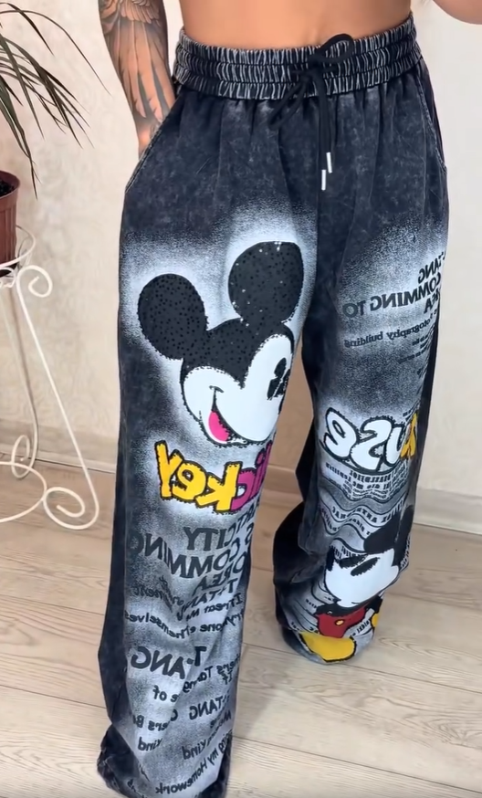 Design: Teljes színű minta rajzfilmgrafikával + mosási folyamat, azonnal feldobja az utcai trendet, a széles szárú változat elrejti a húst és kiemeli a hosszú szárakat, a magas derékrész húzózsinórral különböző derékméretekhez igazodik.
