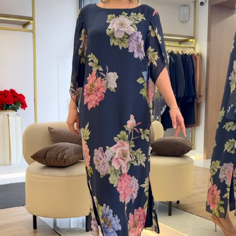 Elegáns hosszú női ruha nyomtatott nyakkivágással