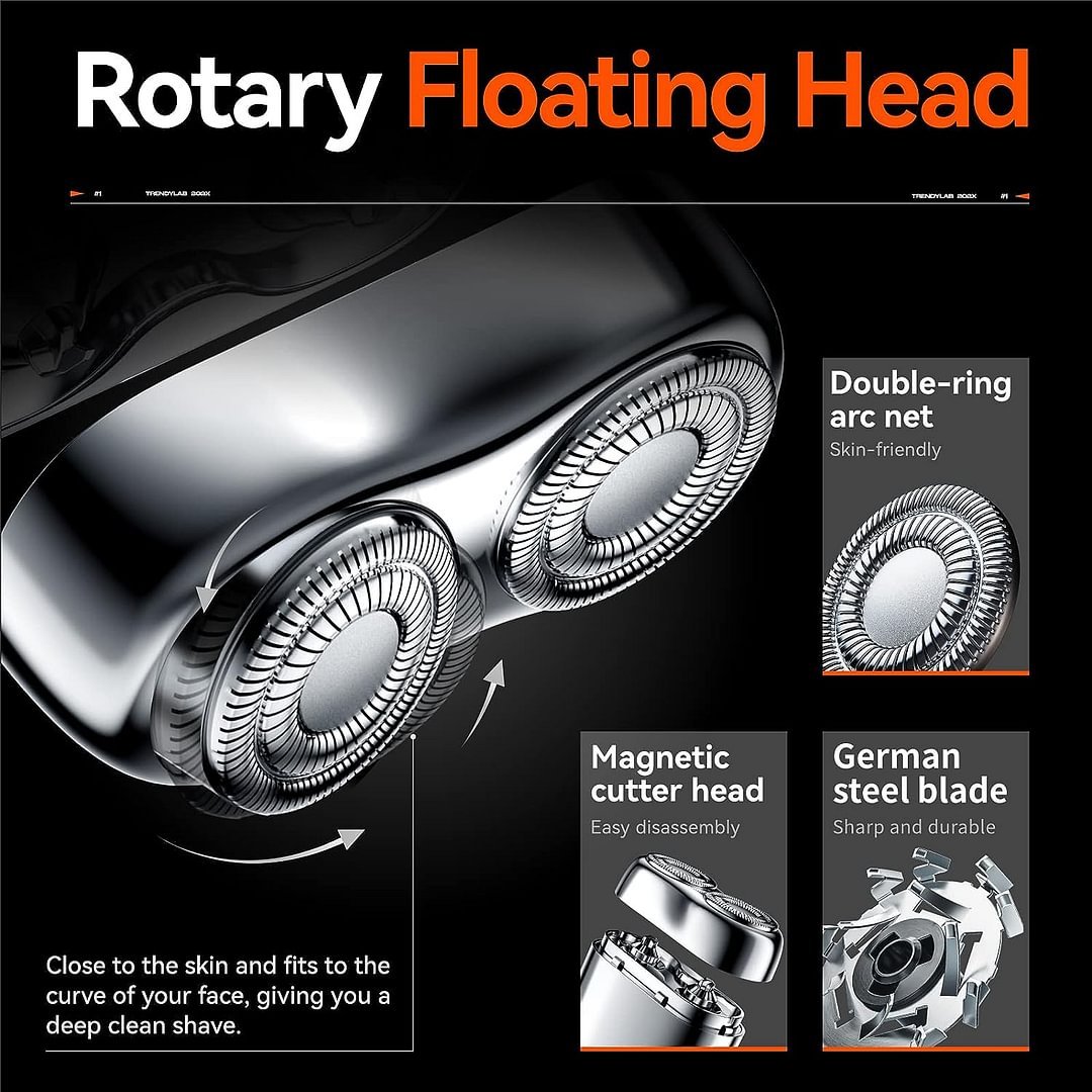 Éles, rozsdamentes acélból készült pörgető penge, speciálisan a kemény szakállakra, 0,1 mm vékony rozsdamentes acél fólia, dupla gyűrűs 3D pengeháló, növeli a borotválkozás mennyiségét, kisimítja a lebegő ív felületét és eltávolítja a szőrszálakat a bőrről.