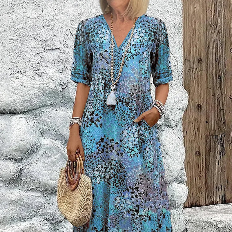 A készlet tartalma: 1*Női ruha világos mintával és V-nyakkal