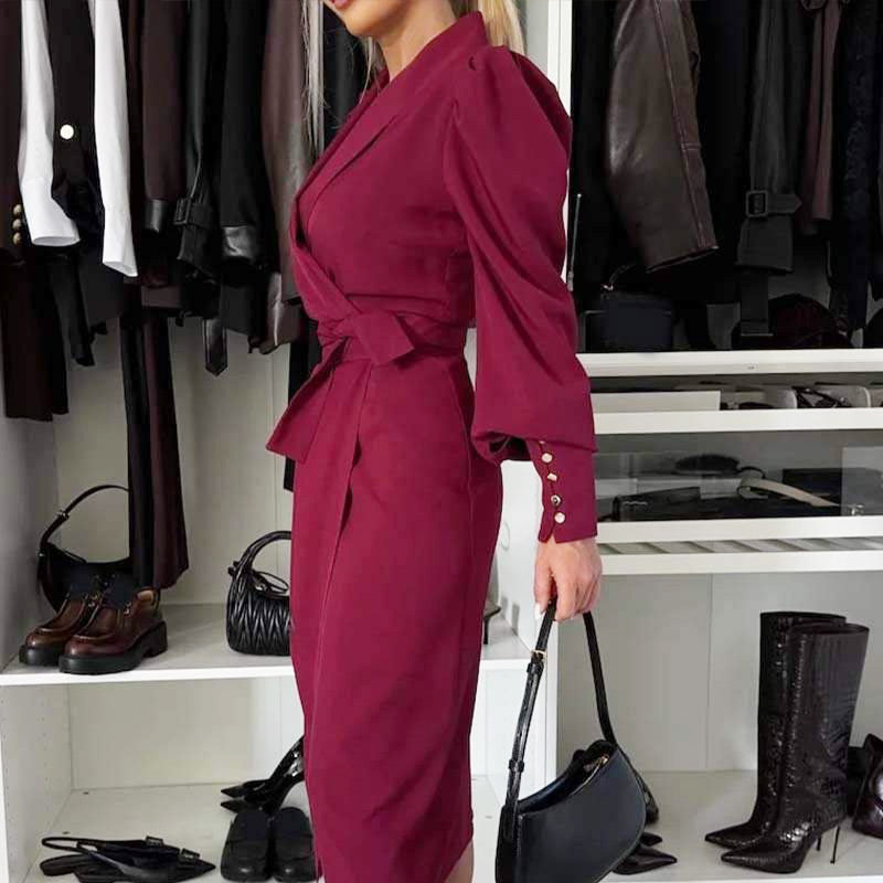 Női hosszú ujjú ruha V-nyakkal, derékban megkötővel