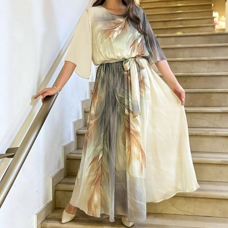 ELEGÁNS ÉS FOLYÉKONY KIVONAT – Ez a kereknyakú maxi ruha áramló sziluettjével és egyedi, szabálytalan mintájával kifinomult eleganciát kölcsönöz mind a hétköznapoknak, mind a formális alkalmaknak. A könnyű anyag egész napos kényelmet és stílust biztosít.