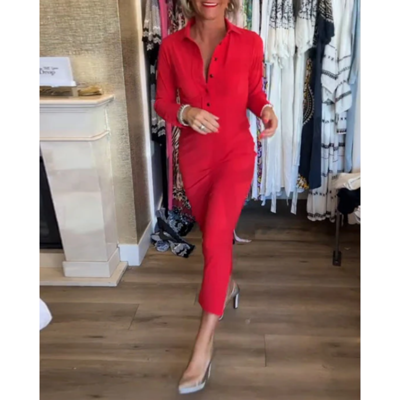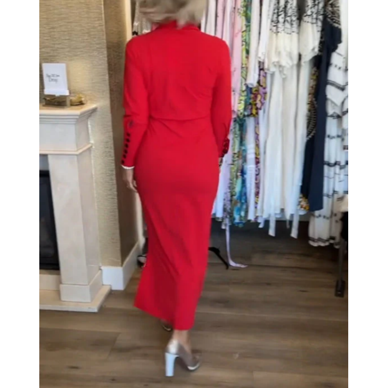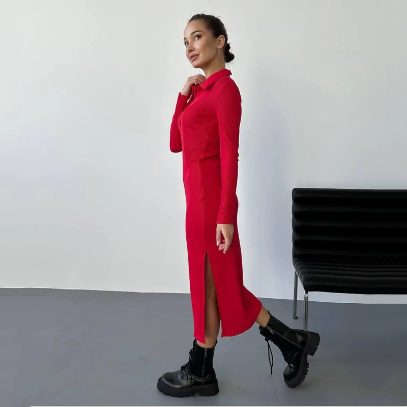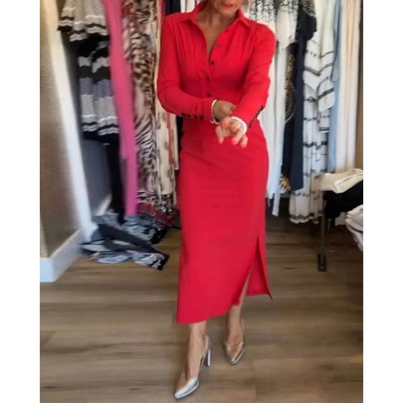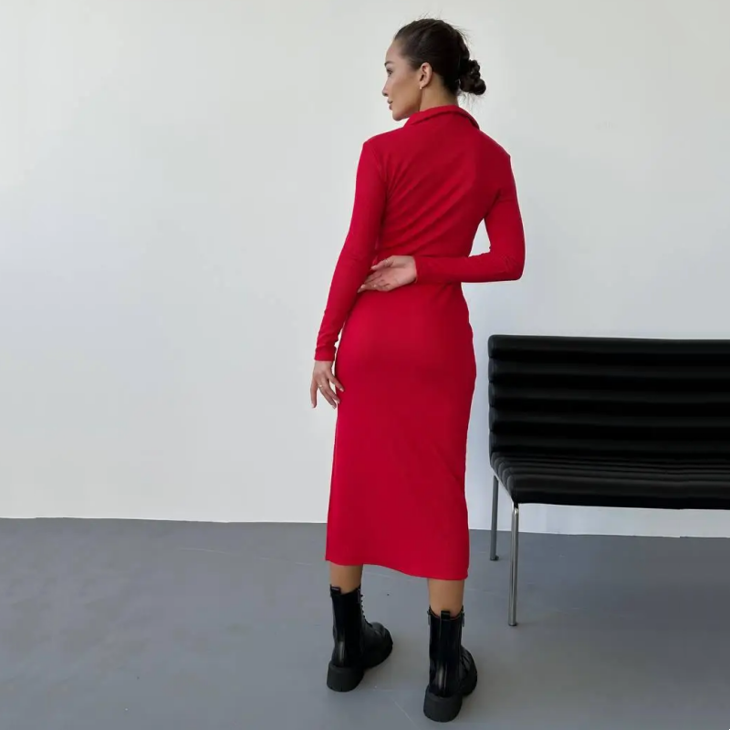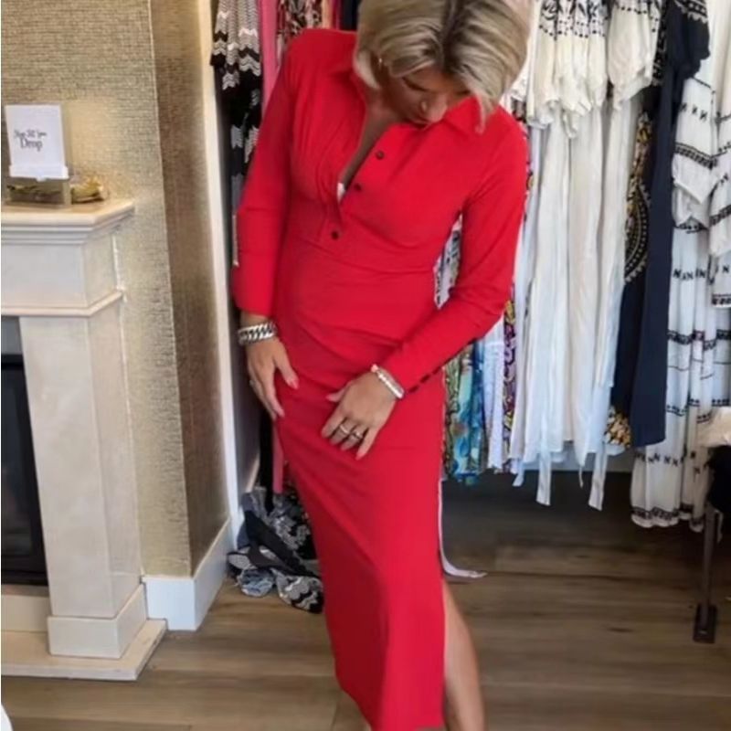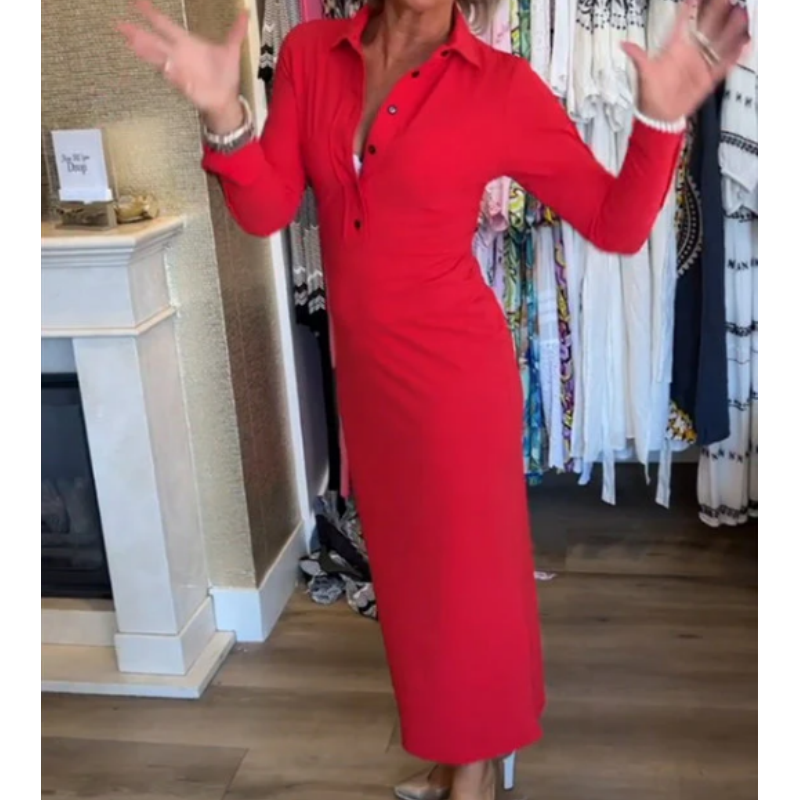 Szexi piros női ruha, hosszú ujjú és hajtókával